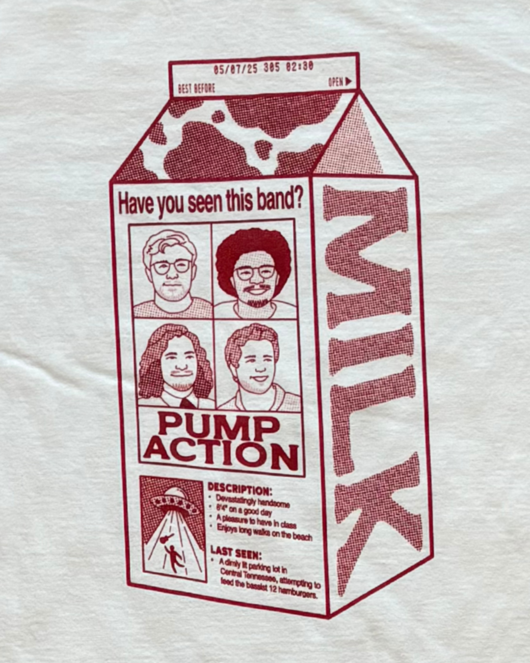 Our most popular shirt! A Milk Carton with a "Have You Seen This Band?" ad, complete with Pump Action's four lovely faces and some funny descriptions about them. The shirt is comfort colors, 100% cotton, white with red design. No milk included!